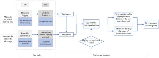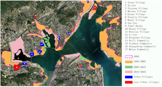 The urbanization of China has undergone a leapfrog transformation in a short period of 20 years from the time of the long-lagging state to the reform and opening-up periods. Taking Xiamen City as an example, since the strategy of transforming the city from an island city to a bay city was launched in 2002, through the comprehensive improvement projects of bay areas such as Wuyuan Bay, Xinglin Bay, Huandong Sea Area, and Maluan Bay, a model of organic integration of bay and urban development has been created [18,19]. Driven by the combined forces of population growth, economic development, government planning, and the contradiction of land resources, Xiamen City has expanded urban space through sea reclamation to alleviate the crisis of insufficient space [19]. The rapid expansion of Xiamen City implies the pressure to cover the surrounding rural areas. In order to absorb a large number of rural migrant workers fusing to the city, developers are trying to acquire the easiest plots to deal with in the shortest possible time to provide homes. However, when it comes to spaces such as ancestral halls and temples in traditional settlements, they often choose to take detours to avoid complex property rights issues. These traditional villages scattered along the coast of the bay, mainly engaged in fishing, have gradually transformed into urban villages that combine traditional texture with modern features as the development of the Bay Area progresses. Urban villages not only retain the spatial memory of the village society, but also carry the housing needs of industrial workers, forming a spatial bond connecting tradition and modernity.