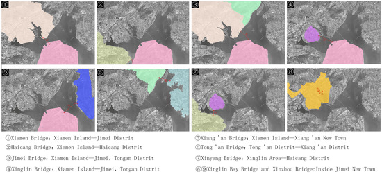 The development of island cities needs to rely on transportation, and is limited by island resources, so the transportation trunk line becomes the lifeline of the economic development of island cities and the skeleton of its urban space development [51]. According to the development plan of Xiamen as a bay-type city, the focus of urban construction is shifted from inside the island to the Bay Area outside the island. In order to meet the requirements of urban space expansion, it is necessary to increase the overall planning of Xiamen urban traffic [40]. Before the construction of Xiamen Bridge, it was difficult for Gaoji Seawall, as the only land–island passage, to meet the surging traffic demand of the special zone construction. Xiamen Bridge connects Xiamen Island and Jimei Peninsula, which greatly improved the traffic conditions and investment environment of Xiamen [52]. Since then, important bridges such as Haicang Bridge (1996–1999) [53], Jimei Bridge (2006–2008), Xinglin Bridge (2006–2008) [54], and Tong An Bridge (2005–2007) [42] have been built successively. Xinglin Bay Bridge and Xinzhou Bridge are important hubs for internal communication within Jimei New Town [55,56]. It has fully opened up the transportation inside and outside Xiamen Island, connecting Xiamen Island with various inland plates, marking the crossing of Xiamen from an “island city” to a “bay city” (Table 4, Figure 4).