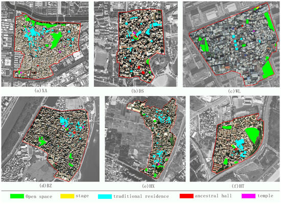 Most of the urban villages in the study area retain temples, ancestral halls, theatrical stages, and traditional buildings, leaving traces of traditional settlements. Among them, WL (Figure 5c) on the island is an exception. Almost all WL buildings are modern structures with more than six floors whose exterior is square and whose interior structure is simple. The open space is mainly used for parking and residents’ activities, and the only traditional buildings are built as public spaces for community residents. XN (Figure 5a) is the largest urban village outside Xiamen Island, and it has a high density of modern buildings mostly with six to nine floors. There are still many unfinished buildings in the village, and traditional buildings are centrally distributed, some of which are rented, and some of which the indigenous people use for themselves to live in. Most of the open space is used as a parking lot, except for the pocket park and public square at the entrance, and XA seriously lacks space for residents to engage in activities. In DS (Figure 5b), BZ (Figure 5d), HX (Figure 5e), and HT (Figure 5f), the resident population is mainly indigenous, and the temples, ancestral halls, and stage are all completely preserved. Except for DS, the other three urban villages have modern buildings below three floors. In terms of the utilization of traditional buildings, DS and HX have undergone modernization for commercial development, while BZ and HT are in a state of conservation and repair. The distribution of open space in these four villages is relatively scattered, and most of the functions are for residents’ leisure activities.