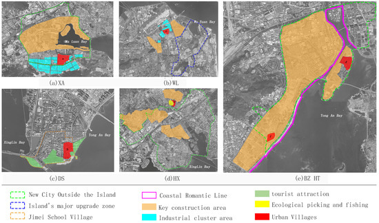 The structural framework of Xiamen Bay urban space is based on the island, and the Bay Area has become the focus of urban space expansion and construction in Xiamen [59]. Before 1980, the spatial scale and structure of urban villages in the Xiamen Bay Area were in the state of original villages, and villagers relied on fishing, breeding, and farming to maintain their livelihood [60]. Since 1980, when the construction of the Xiamen Special Economic Zone started, the island’s urbanization has developed rapidly.