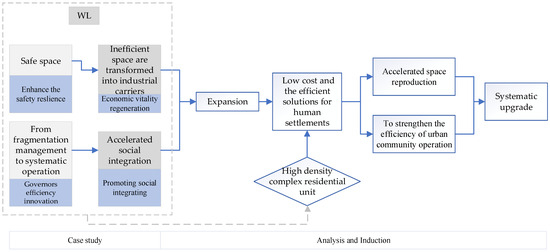 XA is adjacent to the Xinyang Industrial Zone and Maluan Bay New City Construction Area (Figure 6a), is mainly based on housing rental, and has gathered a large number of workers with complex structures. Its current renewal focuses on improving human settlements, infrastructure, risk mitigation, and security, with the goal of creating safe communities for locals and migrants to live and work in. Similarly, WL (Figure 6b), which is also mainly based on leasing, is located near the large upgrading area in the island, and the modernization process started earlier. Now it is mostly modern rental housing, and the tenant group is younger. As a talent apartment community in Xiamen, it is committed to creating a young community that is both modern and full of life. For example, the creative market developed by using idle land is also a consumption space for young trends.