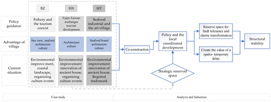 HT and BZ are located along the coastal romantic line of Tongan District (Figure 6e). The coastal romantic line is the main position for Tongan District to build a cultural and tourism consumption cluster and scatter the spillover tourists in Xiamen Island. These two villages are designed to accommodate the tourists of the coastal romantic line and extend their stay practice, while preserving the characteristic architecture and seafood food in southern Fujian, filling the vacancy of the romantic line in regional culture and catering. HT focuses on building art tribes and catering brands, while BZ focuses on building coastal landscapes and “punch points” by virtue of the advantages of being surrounded by the sea.