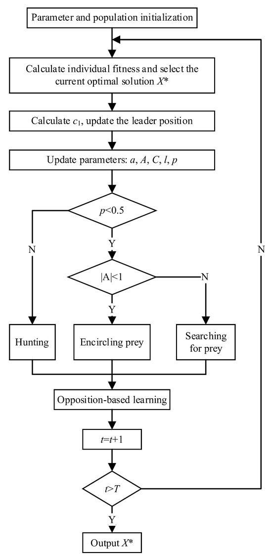 The whale optimization algorithm (WOA) [41] is a nature-inspired metaheuristic that simulates the predation behavior of humpback whales. By modeling behaviors such as spiral hunting and dynamic encircling, the WOA provides a simple yet powerful search mechanism with few parameters and strong global search capabilities. However, the WOA tends to suffer from local convergence and slow optimization speed in complex, high-dimensional problems.