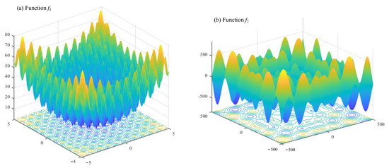 As seen in Figure 2, these test functions feature multiple extrema, and their high dimensionality and wide parameter ranges demand optimization algorithms with strong capabilities in search range coverage, convergence speed, and ability to escape local optima. For both functions, the dimensionality of independent variables is set as n = 10. The global minimum value of function f1 is 0, while the global minimum of function f2 is −418.9829 × n = −4189.829.