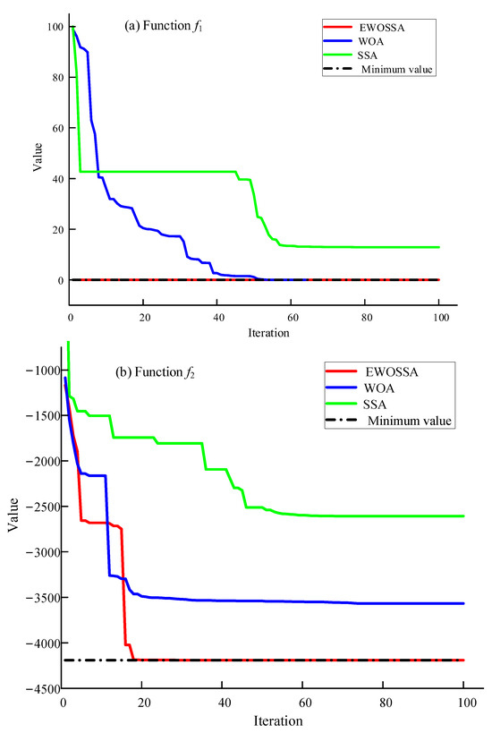 For function f1, both the WOA and EWOSSA achieved the theoretical minimum value of 0, while the SSA converged to a suboptimal solution. For the more complex function f2, the EWOSSA achieved a value of −4187.55, significantly closer to the theoretical minimum (−4189.829) than either the WOA (−3510.35) or the SSA (−2867.13).