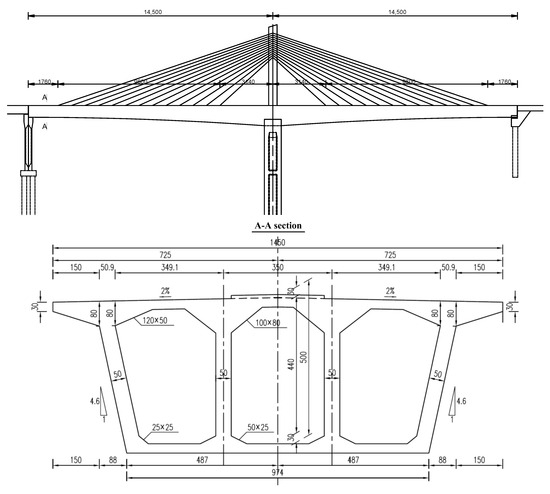 The reinforced-concrete towers rise 48 m above the deck, featuring a solid C50 concrete rectangular cross section with rounded chamfers (5 m in longitudinal direction and 3 m transversely). The main girder is structurally integrated with the towers and piers to form a cohesive tower–girder–pier system. The bridge employs 26 symmetrical cable pairs in a fan configuration, with cables spaced at 1.2 m intervals. Figure 5 illustrates the complete bridge layout and structural arrangement.