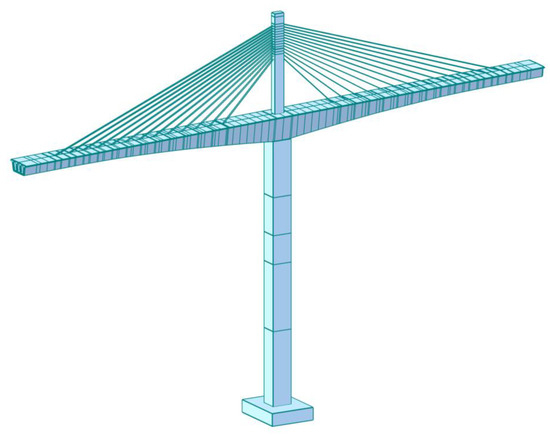 Three-dimensional view of the finite element model of the case study cable-stayed bridge.