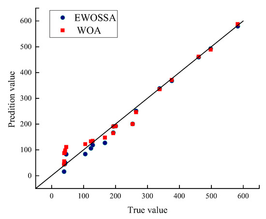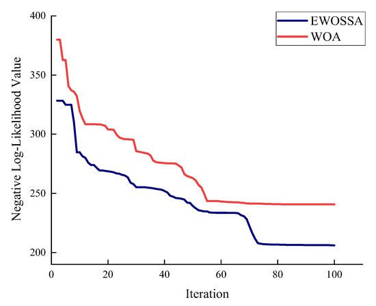 For the GPR model development, 60 sets of cable forces–bending strain energy data are randomly selected as training samples, reserving the remaining 20 sets for validation purposes. Figure 7 presents the convergence curves of the negative log-likelihood function for both the standard whale optimization algorithm (WOA) and our proposed enhanced whale optimization algorithm with Salp Swarm Optimization (EWOSSA). The results demonstrate that the EWOSSA consistently achieves superior performance throughout the optimization process, including initial, intermediate, and final stages.