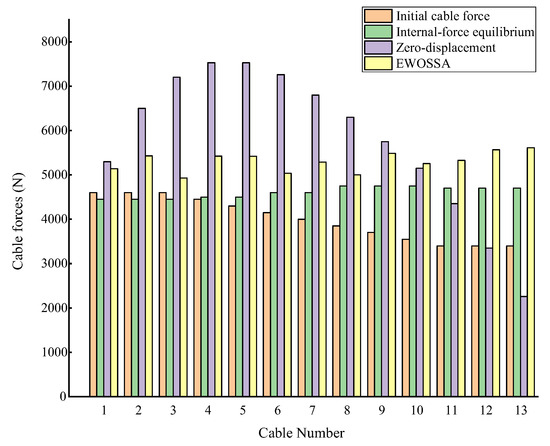 The analysis results (Table 4 and Figure 9) reveal that the cable forces derived from the zero-displacement method exhibit significant dispersion, indicated by the highest uniformity coefficient (0.28), suggesting poor uniformity. In contrast, both the internal-force equilibrium method and the EWOSSA-GPR method yielded considerably more uniform cable forces, with coefficients of 0.03 and 0.04, respectively. Compared to the initial cable force state (coefficient of 0.12), the internal-force equilibrium method improved uniformity by 77.7%, while the EWOSSA-GPR method achieved a 65.8% improvement, demonstrating the effectiveness of both approaches in achieving more evenly distributed cable forces. Figure 9 illustrates the cable force distributions for each method.
