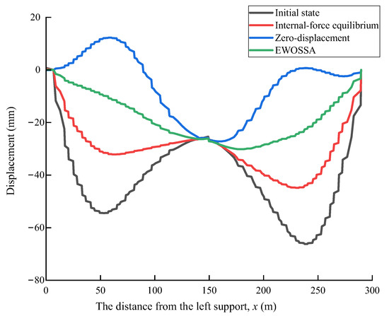 All optimization methods successfully reduced the maximum vertical displacement of the main girder compared to the initial state. As detailed in Table 5 and illustrated in Figure 10, the zero-displacement method resulted in the smallest maximum girder displacement (−27.18 units), achieving the most significant reduction (58.9%) and thus the most favorable girder shape in terms of deflection minimization. The EWOSSA-GPR method also yielded a substantial reduction in maximum displacement (54.5%, to −30.13 units). The internal-force equilibrium method showed the least improvement, reducing the maximum displacement by 32.2% (to −44.85 units), resulting in a comparatively less optimal girder shape regarding displacement.