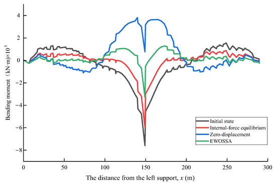 The distribution of bending moments along the main girder varied significantly between methods (Table 6, Figure 11). The internal-force equilibrium method proved particularly effective in minimizing positive (sagging) bending moments and achieving the lowest mean bending moment, consistent with its underlying principle. This method reduced the maximum positive moment by 43.8% compared to the initial state, although its effect on the maximum negative (hogging) moment was less pronounced, showing only a 21.4% reduction.