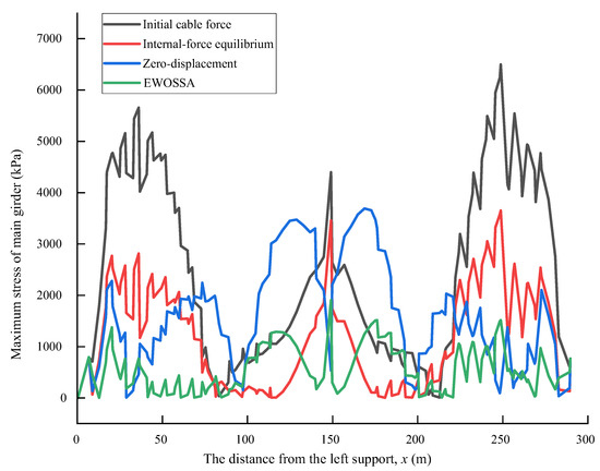 The internal-force equilibrium method and the zero-displacement method achieved less significant, though still considerable, stress reductions. The internal-force equilibrium method reduced maximum stress by 43.8% and mean stress by 50.8%. The zero-displacement method resulted in reductions of 43.1% for maximum stress and 39.1% for mean stress. However, both of these traditional methods resulted in less optimal distributions of maximum stress along the girder compared to EWOSSA-GPR.