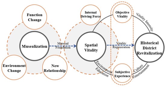 The concept of “musealization” was first introduced by Czech museologist Zbyněk Stránsky in 1965. The original meaning of “musealization” is to extract “objects” from their real temporal and spatial contexts, transforming them into “museum objects” [9,10]. The process of musealization includes three aspects: (i) “loss of function” or “alteration of function”; (ii) “alteration of context”; (iii) “a new relationship between the subject (viewer) and the object” [11]. In recent years, the rise in cultural tourism has led historical cities to undergo profound transformations. Museum theory is widely applied in the research on the preservation of historic districts [12]. Many historical buildings are repurposed as museums, and cities or archaeological sites are regarded as open-air museums [13]. The boundary between museums and historical districts has disappeared [14,15].