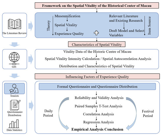 The rapid development of cultural tourism has led to a significant spatial imbalance in vitality distribution within the Historic Center of Macau. According to statistics from the Macau Government Tourism Office, during the International Workers’ Day holiday in 2025, Macau received nearly 177,000 visitors. The Ruins of St. Paul’s and the Holy House of Mercy attracted a large number of tourists due to their uniqueness and high recognition, resulting in a high level of spatial vitality. Meanwhile, other cultural heritage sites remain relatively neglected and receive less attention [1,2,3]. Therefore, how to effectively enhance the spatial vitality of the Historic Center of Macau, support its status as a World Center of Tourism and Leisure, and promote the development of cultural tourism have become urgent issues.