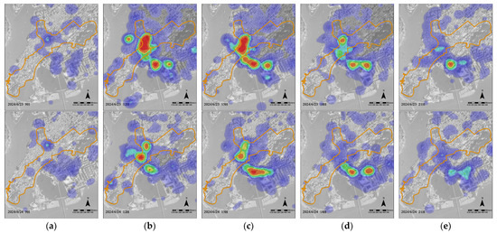 Baidu heatmap of festival and daily periods: (a) 09:00; (b) 12:00; (c) 15:00; (d) 18:00; (e) 21:00.
