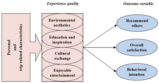 From the perspective of experiential quality, this study adopts Pine and Gilmore’s model. Pine and Gilmore’s model is widely used to measure the tourist experience while visiting historic sites and museums [49]. Pine and Gilmore’s experience economy model was chosen because it offers a comprehensive framework for evaluating the multidimensional aspects of visitors’ experiences, particularly in the context of cultural heritage and historical districts. Based on a comprehensive review of the relevant literature and the objectives of this research, this study constructed a historic district experience quality model. The model includes four main dimensions: environmental aesthetics, education and inspiration, cultural exchange, and enjoyable entertainment (Figure 6). In order to ensure the scientific design of the questionnaire, the final design of the questionnaire was reviewed and approved by two professors in the field.