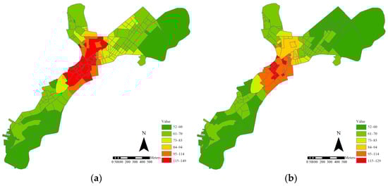 Vitality intensity map of historic district: (a) vitality intensity map for festival period; (b) vitality intensity map for daily period.
