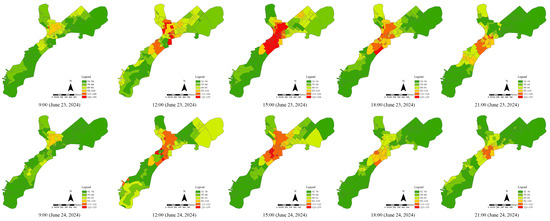 In terms of data collection, data were collected from 9 am to 9 pm during the festival period (23 June 2024) and the daily period (24 June 2024), with data collected every hour, resulting in a total of 26 time points. Each recorded point contains four attributes: longitude, latitude, time, and heat. The experimental date chosen for this study avoids the interference of unexpected factors such as extreme weather. These dates are considered suitable for outdoor activities and are representative of typical conditions (Figure 5).