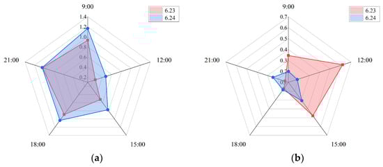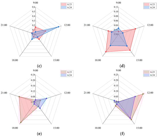 This study used a radar chart in the Origin 2021 software to visualize changes in the vitality intensity of the historical district. Figure 9 shows that the spatial extent of each level of vitality changed over time. In the radar chart of the high-heat area, the historical district reached 0.24 km2 at 12:00 during the festival period (23 June). In the radar chart of the sub-heat area, the area during the festival period (23 June) reached 0.22 km2 at 16:00 and 0.17 km2 at 21:00. The results indicate that the vitality of the historical district during the festival period is higher than during the daily period in the high-heat and sub-heat categories (Figure 9).