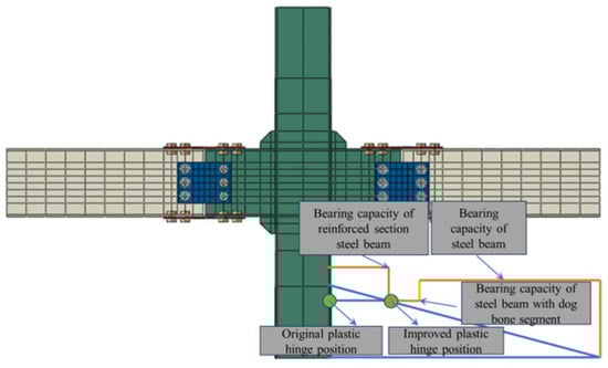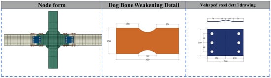 This innovative joint type is classified as a replaceable and easily repairable form, which also has the feature of concentrating damage in defined areas following seismic events. The design principles for this joint are analogous to the principles governing joints with plastic hinges that exhibit outward movement, as illustrated in Figure 2. The bending moment (M) induced by the external load at the terminus of the beam within a given point along the steel beam exhibits a direct relationship with the distance between that point and the beam’s end. In the event of no alteration to the cross-sectional dimensions of the steel beam, the beam’s flexural capacity (Mu) will remain constant. The initial plastic hinge is anticipated to develop at the location of the maximum M/Mu ratio, namely the core region of the joint. The implementation of the V-shaped steel and the dog-bone weakened connector serves to diminish the strength of the steel beam. Consequently, the strength of the spliced energy dissipation section decreases, facilitating the transfer of the plastic hinge from the central area of the node to the spliced energy dissipation beam section []. This process realizes the outward movement of the plastic hinge. In the presence of reciprocating loads on the beam section, the damage associated with plastic energy dissipation from bending moments and shear forces at the beam’s terminus is localized at the dog-bone weakened and V-shaped steel connector.