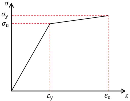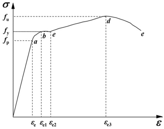 The constitutive model of ordinary steel adopts the constitutive model considering the platform section and the strengthening section proposed in reference [], and the specific constitutive relationship is as shown in Figure 5.