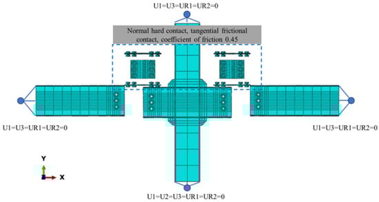 Due to the middle column joint being located at the beam-column inflection point in the frame, hinged boundary conditions are implemented at the upper and lower ends of the column and at the beam’s loading point. To mitigate out-of-plane instability of the joint surface, an additional out-of-plane constraint is applied within the core area of the joint, specifically setting U1 = U3 = UR1 = UR2 = 0. The top of the column and the ends on both sides are allowed degrees of freedom in the U2 and UR3 directions. Axial loading is applied at the top of the column, and reciprocating loading is applied at the beam’s terminal end.