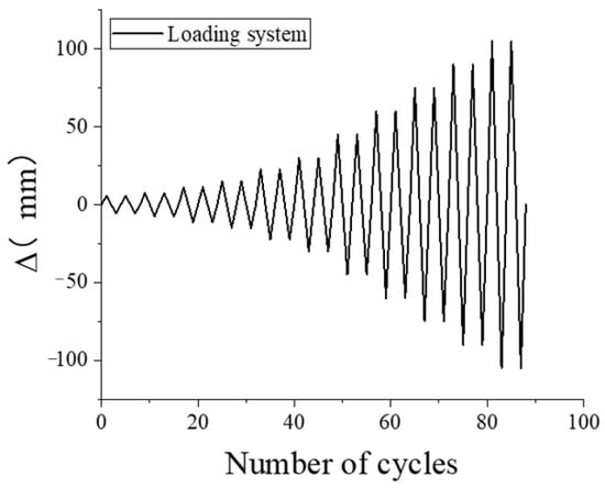 Axial force is induced at the top of the column through force application, with an axial compression ratio of 0.4. The member is subjected to loading at the beam end. The loading procedure is based on displacement loading, in accordance with the Code for Seismic Test of Buildings (JGJ/T101-2015) [], and a detailed representation of the loading procedure is provided in Figure 7.