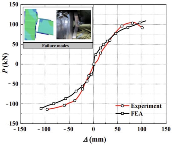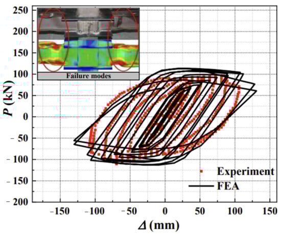To validate the accuracy of the finite element model, a comprehensive finite element simulation analysis is conducted on the experimental data presented in references [,]. Given the similarity between the test joints in the literature and the joint form addressed in this article, the verification model is set up with the same element selection, mesh division, and boundary conditions as outlined in Section 2.2, in order to ascertain the accuracy of the above-mentioned modeling method. Figure 8 provides a comparative analysis between the hysteretic curves derived from the experimental data in reference [] and the corresponding finite element analysis results. Similarly, Figure 9 presents a comparative analysis between the skeleton curves obtained from the experiment in reference [] and the associated finite element analysis.