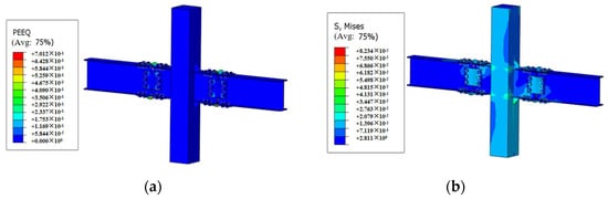 Figure 10 presents the distribution of equivalent plastic strain and Mises stress at a 4% inter-story drift angle of the typical member. Figure 10a indicates that the plastic hinge formation in the joint is predominantly concentrated at the sections of the dog-bone and V-shaped steel connectors. The V-shaped steel components form X-shaped shear bands during loading, which contribute more than 50% of the system’s total energy dissipation capacity. Simultaneously, the flange sections in the dog-bone weakened zones experience full cross-sectional yielding, demonstrating the effectiveness of the plastic hinge design. This dual energy-dissipation mechanism operates through a coordinated sequence: the V-shaped steel’s shear bands activate first to absorb the majority of energy, followed by progressive yielding of the dog-bone flanges as a secondary energy-absorbing mechanism. The formation of distinct X-pattern shear bands in the V-shaped steel components confirms the anticipated shear-dominated energy dissipation behavior, while the complete yielding of the dog-bone flanges verifies the proper functioning of the weakening design. Together, these complementary mechanisms provide a balanced and hierarchical energy dissipation system that effectively localizes damage while maintaining overall structural stability and performance, with other regions maintaining near-elastic conditions. The observed failure mode is section failure of the plastic hinge at the beam end. Figure 10b further highlights the presence of significant stress concentrations at the weakened portion of the dog-bone and the connection point of the V-shaped steel connector, suggesting that the introduction of an arc angle at this location could effectively reduce stress concentration. Moreover, this phenomenon underscores that the weakened configuration of the dog-bone and the structural dimensions of the V-shaped steel are pivotal in dictating the successful outward movement of the plastic hinge. Concurrently, these elements serve as key parameters that govern the failure mode.