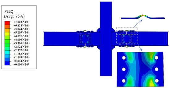 Figure 11 illustrates the localized regions of plastic damage within the joint. The figure indicates that the damage is predominantly concentrated at the V-shaped steel connector and the dog-bone weakened connector, while the remaining portions of the structure remain in the elastic stage. This structural arrangement effectively aligns with the design objectives of damage containment and the post-earthquake replaceability of components.