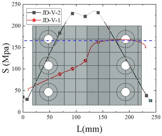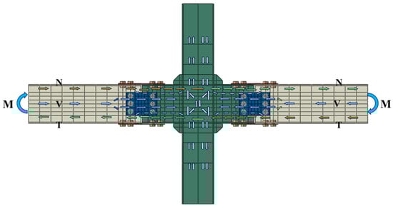 Figure 12 presents the stress distribution across the connectors within the joint area. The figure reveals that the horizontal tensile and compressive stresses on the upper and lower flanges of the beam are conveyed to the bolt hole positions, subsequently transferred to the upper and lower dog-bone weakened connectors through the bolts, and further into the joint area via the dog-bone weakened connector. Similarly, the vertical shear stress of the beam’s web member is transmitted through the bolt holes to the V-shaped steel member, and finally into the column joint area through the cantilever beam section []. The clarity of the force transmission path underscores the importance of reasonable structural design in achieving a reliable force transfer. A summary of the distribution of the horizontal tensile and compressive stresses, as well as the vertical shear stresses, is depicted in Figure 13, outlining the force transmission path of this novel joint type.
