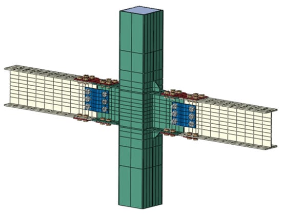 In the analysis, the joint configuration of the central column is selected. The H-shaped steel beam dimensions are 300 × 150 × 5.5 × 8, the square steel tube column dimensions are 250 × 250 × 10, and the bolt specification is M20 friction-type high-strength bolts (units in millimeters). After verification, the beams, columns and designs all meet the design requirements of strong column and weak beam, and strong joint and weak component stipulated in the Code for Seismic Design of Buildings (GB50011-2010 (2016)) []. The bolt hole spacing between each component meets the size requirements stipulated in the Standard for Design of Steel Structures (GB50017-2017) []. The dimensions of each component in mm are shown in Figure 3. The joint design concept simultaneously satisfies three international seismic standards: (1) compliance with AISC 341 requirements for Special Moment Frames, (2) achievement of Dissipative Capacity High (DCH) grade per the EN 1998-1 European code for energy dissipation capability, and (3) incorporation of reduced beam section (RBS) details with 20% flange width reduction, which falls within AISC’s prescribed range for RBS connections. This multi-standard compliance demonstrates the design’s robust seismic performance, adhering to both American and European seismic provisions.