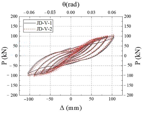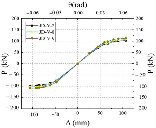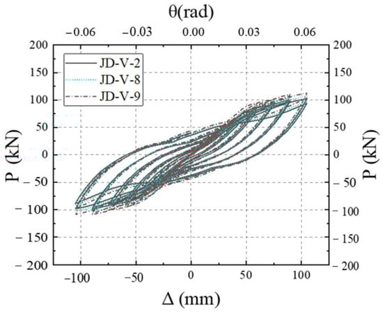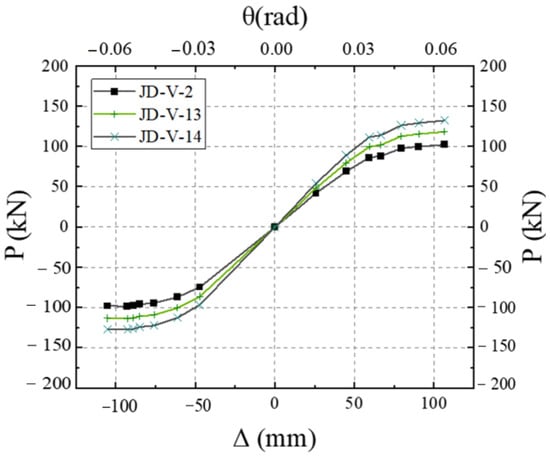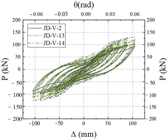 Figure 39 illustrates the skeleton curves for each member. Analysis of the equivalent viscous damping coefficients, which are 0.292, 0.287, and 0.276 for members JD-V-1, JD-V-13, and JD-V-14, respectively, reveals an upward trend. This indicates that the increase in the strength of the dog-bone leads to a weakened deformation capacity of the beam section, a poorer plastic hinge outward movement effect, and a reduction in energy dissipation capability.