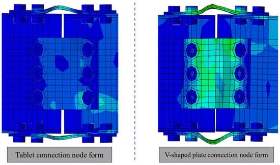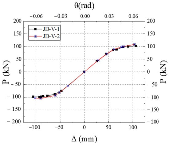 The calculations for a novel beam-column connection joint, employing V-shaped steel as a replaceable component for energy dissipation, and the energy dissipation connection node utilizing a flat member are executed. The load-displacement curve derived from these calculations is depicted in Figure 16. Figure 16 illustrates the hysteretic curves for each member. The V-shaped steel connector in the JD-V-2 member demonstrates an opening and closing action under the reciprocating load at the beam end, manifesting as a distinct pinching effect in the hysteresis curve. This behavior results in a reduced fullness degree compared to the JD-V-1 member.
