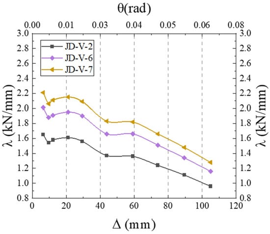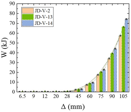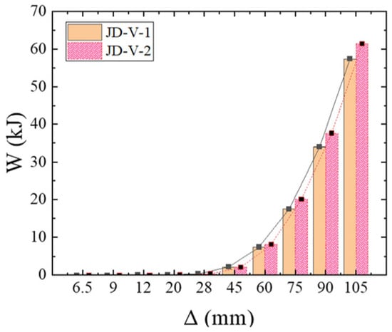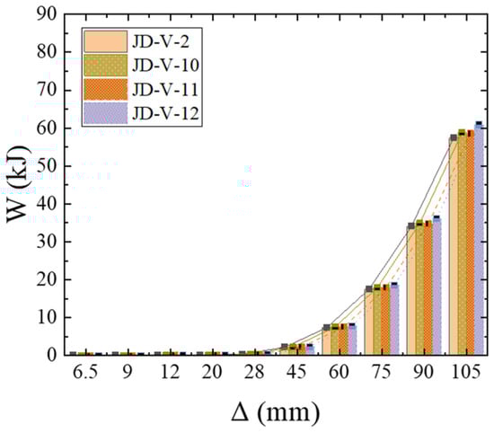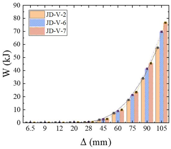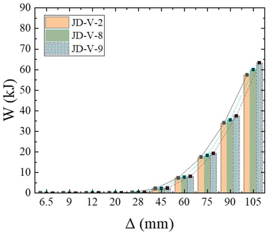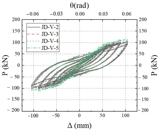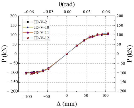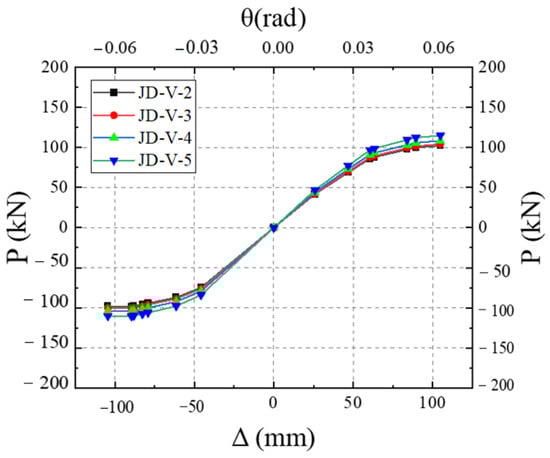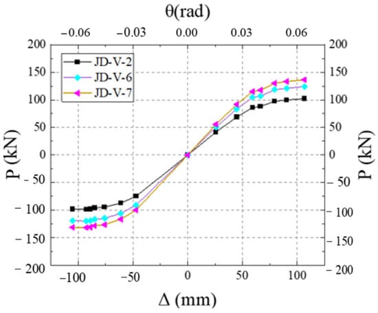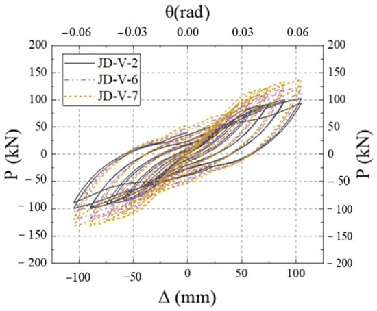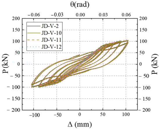 Figure 27 illustrates the skeleton curves for each member. Analysis of the equivalent viscous damping coefficients for members JD-V-2, JD-V-6, and JD-V-7, which are 0.292, 0.273, and 0.257, respectively, reveals a declining trend. This indicates that the increase in the strength of the V-shaped steel leads to an increase in the strength of the extended section of the joint, which in turn results in an inefficient plastic hinge migration effect and a decrease in the joint’s energy dissipation capacity.
