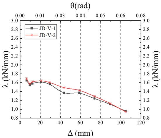 Figure 18 and Figure 19 illustrate the viscous damping coefficient and stiffness degradation curves for members featuring various connection configurations. Member JD-V-2 demonstrates an initial stiffness enhancement of 1.7% relative to JD-V-1, with a corresponding increase in ultimate bearing capacity of 1.3%. The ductility coefficients for JD-V-1 and JD-V-2 are 3.32 and 3.62, respectively, and the cumulative energy dissipation capacity is augmented by 7.53%. To summarize, the mechanical performance of the joint configuration utilizing a V-shaped steel connector surpasses that with a flat member connector, and the ductility of the former is also more pronounced than that of the latter.