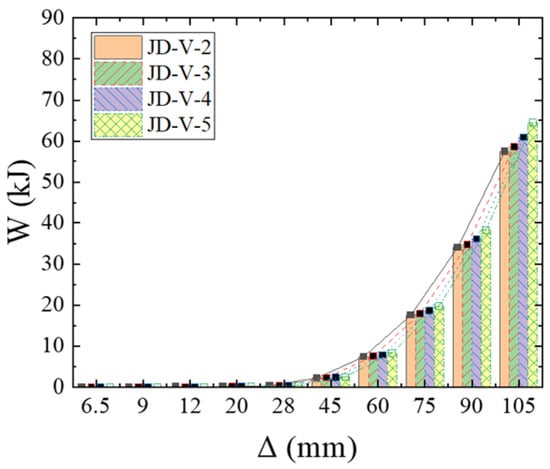 Figure 28 and Figure 29 present the cumulative energy-dissipating diagrams and stiffness degradation curves for members with different strengths of the V-shaped steel connector. Analysis indicates that the initial stiffness of members JD-V6 and JD-V-7, when compared to JD-V-1, has increased by 12.25% and 19.12%, respectively, with the ultimate bearing capacity rising by 20.1% and 27.01%, respectively. However, the ductility coefficients have decreased by 5.7% and 8.6%, respectively. In conclusion, the strength of the member increases with the increase in the strength of the V-shaped steel connector. It is advised that the V-shaped steel connector should have a strength value corresponding to the LY160 grade.