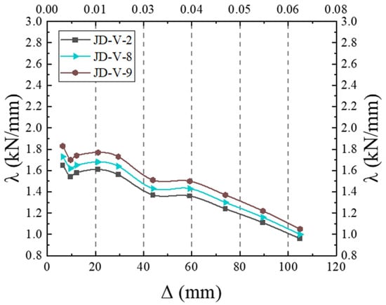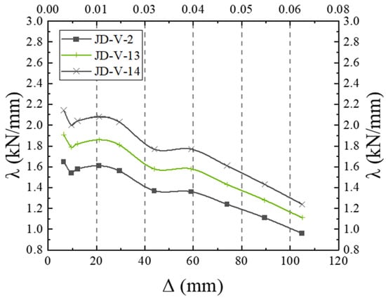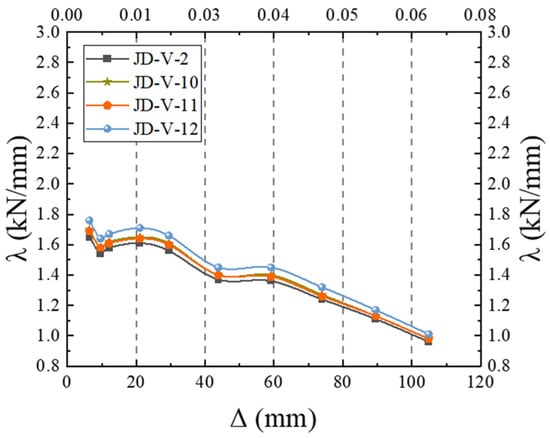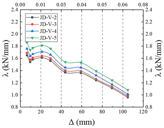 The skeleton curves for the models are illustrated in Figure 23. Analysis of this figure reveals that the equivalent viscous damping coefficients for members JD-V-2, JD-V-3, JD-V-4, and JD-V-5 are 0.292, 0.287, 0.284, and 2.81, respectively, which demonstrate a declining trend. This indicates that an increase in the thickness of the V-shaped steel connector results in an enhancement of the energy dissipation section’s strength in the joint splice, which in turn leads to increased beam deformation and intensified bolt slippage, thereby diminishing the joint’s energy dissipation capacity.