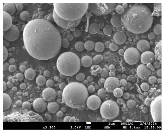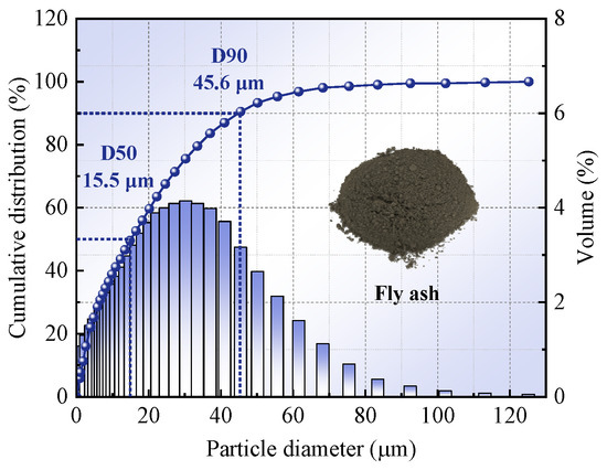 The Class I fly-ash used was obtained from the Huaneng Power Plant in Qingdao, Shandong Province. It had a density of 2300 kg/m3, a moisture content of 0.7%, a water demand ratio of 0.72%, and a strength activity index of 0.72. The chemical composition of the fly-ash is presented in Table 1. Its particle size distribution was analyzed using a laser particle size analyzer (Dandong Bettersize Instruments Co., Ltd., Dandong, China), and the results are shown in Figure 1. The microstructure characteristics of the fly-ash were observed using a field-emission scanning electron microscope (JEOL Ltd., Akishima, Japan), as illustrated in Figure 2.