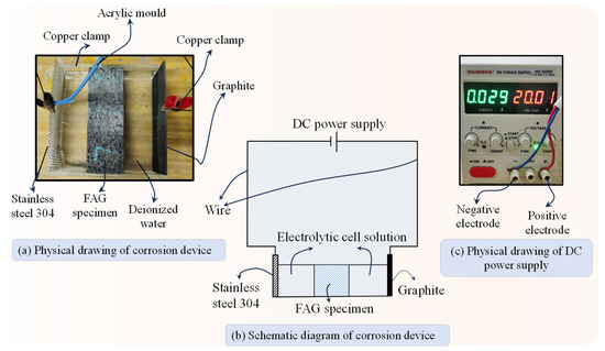 The apparatus used for the coupled erosion tests is shown in Figure 3. A mold with internal dimensions of 120 mm × 120 mm × 40 mm was fabricated using acrylic. Graphite was employed as the anode and 304 stainless steel as the cathode, which were linked to the positive and negative terminals of a DC power supply via copper wires, respectively. Deionized water was used as the electrolyte solution in the electrochemical cell.