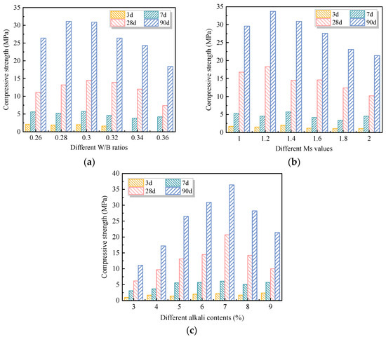 Influencing factors of FAG compressive strength. (a) Compressive strength at different W/B ratios. (b) Compressive strength at different Ms values. (c) Compressive strength at different alkali contents (AC).