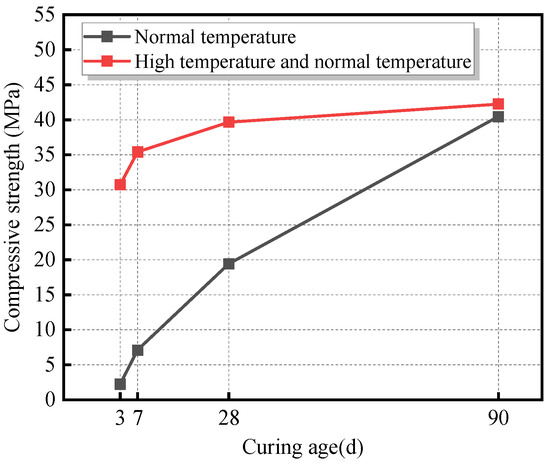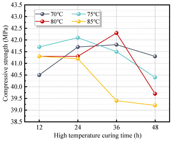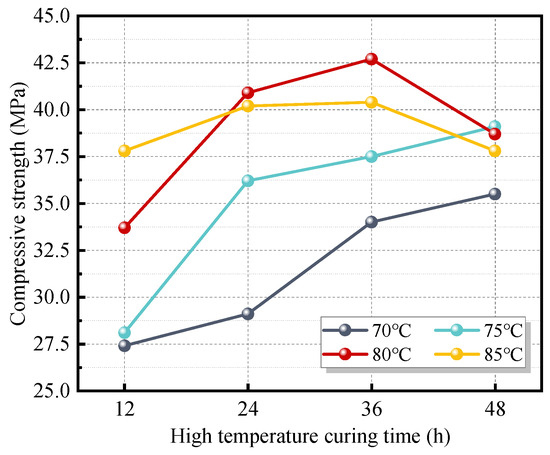 Based on the single-factor experimental results in Section 3.1, the optimal W/B (0.28), Ms (1.2), and AC (7%) were selected as a combined mix to investigate the effects of curing temperature and elevated temperature duration on the compressive strength of FAG. The objective was to determine the most effective high-temperature curing regime.