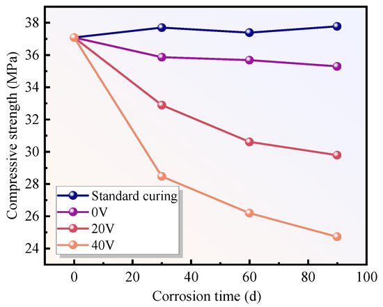 FAG specimens were prepared using the optimal mix design—W/B of 0.30, Ms of 1.2, and AC of 6%—as the reference group. Following 28 d of curing, the specimens were exposed to different electro-corrosion environments (0 V, 20 V, 40 V) and a standard curing chamber. Their initial compressive strengths (defined as those at 0 d of erosion) and strengths after 30 d, 60 d, and 90 d of exposure were measured. The results are presented in Figure 8. Under 0 V (i.e., soft-water erosion without stray-current), the greatest reduction in compressive strength occurred during the first 30 d, with a loss rate of 3.2%. Between 30 d and 90 d, the loss rate decreased to 1.7%. This indicates that while soft-water does exert a certain erosive effect on FAG, the effect is not significant: the total loss in compressive strength over 90 days remained below 5%, and the corrosion rate declined over time. The slight strength loss under the 0 V condition may be attributed to the pH difference. It may also result from factors such as ionic leaching, immersion conditions, and evolving solution chemistry. Under 20 V, the compressive strength decreased progressively with increasing exposure duration. The loss rates at 30, 60, and 90 d were 11.3%, 17.5%, and 19.7%, respectively. A similar trend was observed under 40 V, though with more pronounced reductions: the corresponding loss rates were 23.2%, 29.4%, and 33.4%. By comparing the average loss rate per time interval, the corrosion rate at 20 V was approximately 4.1 times that observed under 0 V, while the rate at 40 V was about 7.2 times higher. These findings indicate that the presence of stray-current significantly accelerates the soft-water-induced deterioration of FAG. Furthermore, the compressive strength loss under 20 V during 0–30 d, 30–60 d, and 60–90 days was 11.3%, 7.0%, and 2.6%, respectively. Under 40 V, the losses for the same periods were 23.2%, 8.1%, and 5.7%. These trends suggest that the rate of compressive strength degradation decreases over time, similar to the pattern observed under pure soft-water exposure.