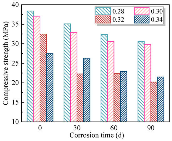 During the 0–30 d period, the average strength loss was 13.9%. This decreased to 6.8% in the 30–60 d period, and to 6.0% in the 60–90 d period, showing a consistent reduction in the rate of strength loss over time. After erosion, the specimen with a W/B ratio of 0.28 shown the highest residual compressive strength of 30.6 MPa. Notably, the specimen with a W/B ratio of 0.30 showed the lowest compressive strength loss rate—dropping from 37.1 MPa before erosion to 29.8 MPa after erosion, corresponding to a 19.7% reduction. This suggests that a W/B ratio of 0.30 provides the most favorable balance between initial strength and durability under aggressive erosion conditions.
