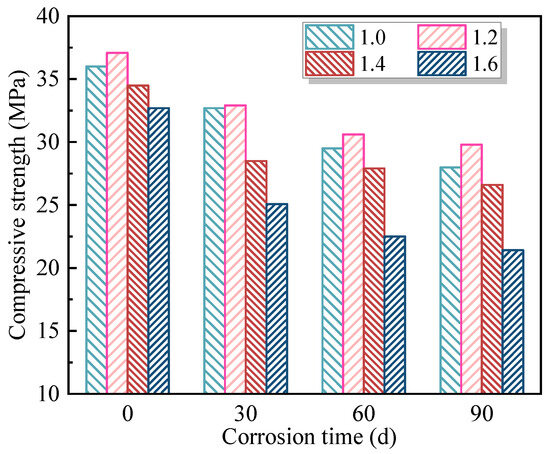 Figure 10 presents the evolution of compressive strength of FAG specimens under 20 V stray-current with varying sodium silicate moduli. All specimens were cast with a constant W/B of 0.30 and an AC of 6%, while the Ms ranged from 1.0 to 1.6 in equal intervals. As shown in the figure, at both the initial stage (prior to erosion) and at all designed erosion durations, the compressive strength of FAG revealed a trend of ascending initially and then declining with the increase in Ms. The specimens with a modulus of 1.2 consistently achieved the highest compressive strength before and after erosion. During the 0–30 d erosion period, the average compressive strength loss rate was 15.3%, decreasing to 7.3% over the 30–60 d period, and further to 4.3% over the 60–90 d period. This declining trend in strength loss rate. After 90 days of erosion, the difference between the maximum and minimum compressive strengths among specimens with moduli ranging from 1.0 to 1.4 was approximately 12.0%. However, when the modulus increased from 1.4 to 1.6, compressive strength dropped by 19.5%. These results indicate that a modulus of 1.2 yields the best erosion resistance under stray-current. Within the range of 1.0–1.4, the effect of Ms on erosion resistance is relatively minor. However, when the modulus exceeds 1.4, the accelerating effect of stray-current on soft-water-induced erosion becomes significantly more pronounced [45].