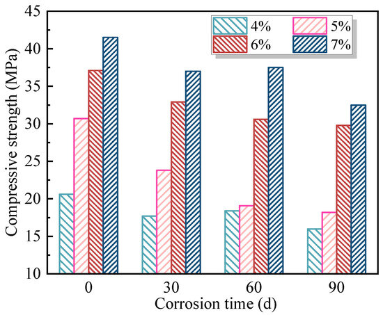 Figure 11 illustrates the evolution of compressive strength of FAG specimens under a 20 V stray-current with varying ACs. All specimens were prepared with a constant W/B of 0.30 and Ms of 1.2, while the AC ranged from 4% to 7% in equal increments. As shown in the figure, both before erosion and during the three erosion periods, the compressive strength of FAG increased with increasing AC. During the 0–30 d erosion period, the average compressive strength loss rate was 14.7%, while it decreased to 8.4% during the 60–90 d period, indicating a declining trend in the rate of strength loss with increasing erosion duration. The specimen with 7% AC exhibited the highest compressive strength both before and after 90 days of erosion, reaching 41.5 MPa and 32.5 MPa, respectively, with a strength loss rate of 21.7%. The specimen with 6% AC showed a comparable 90-day compressive strength, only 2.7 MPa lower, but with a reduced strength loss rate. However, when the AC was reduced from 6% to 5%, the 90-day compressive strength dropped by 28.9%, and the corresponding strength loss rate increased by 21.0%. These results suggest that when the AC is below 6%, the accelerating effect of stray-current on soft-water-induced erosion of FAG becomes significantly more pronounced.