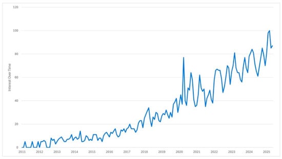 Although biophilic design began gaining popularity in the 2010s, the COVID-19 pandemic brought renewed urgency and attention to the importance of nature-accessible environments. During lockdowns, limited exposure to natural spaces amplified public concern for mental health and well-being, sparking interest in biophilic principles. As illustrated in Figure 1, online search trends for “biophilic design” have increased sharply since April 2020 and have remained elevated. This post-pandemic context has transformed biophilic design from a niche concern into a mainstream imperative. Yet, despite growing interest, implementation across building typologies and geographic contexts remains uneven, with persistent gaps in methodology, standardisation, and contextual adaptation. However, despite increasing interest, notable gaps persist in the standardisation of design parameters, methodological approaches, and contextual adaptation, highlighting the need for a systematic analysis of the current research landscape.