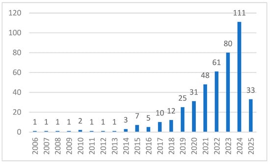 The annual scientific production data (Figure 3) demonstrate a significant upward trend in biophilic design research, particularly after 2019. While the number of publications remained low and relatively stable from 2006 to 2015, interest in the field began to grow gradually between 2016 and 2019. A notable acceleration occurred from 2020 onwards, with the number of studies increasing sharply each year and peaking at 111 in 2024. This surge likely reflects a growing awareness of health, well-being, and sustainability in architectural discourse, especially following the COVID-19 pandemic. Additionally, it should be noted that the increase in publication volume may also be partially attributed to the expansion of database coverage in Web of Science and Scopus over time [].