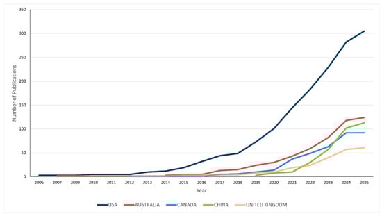 Figure 5 illustrates publication trends from 2006 to 2025 for the five leading countries in biophilic design research: the USA, Australia, Canada, China, and the United Kingdom. The publication trends by country reveal that the USA has maintained a dominant position in biophilic design research, especially from 2015 onward, with a sharp and continuous rise in output. Australia and Canada follow, showing steady growth from around 2017 and experiencing accelerated increases after 2020. China exhibits a notably rapid climb beginning in 2021, quickly closing the gap with other leading countries and indicating emerging leadership in the field. The United Kingdom, while contributing consistently, demonstrates a comparatively modest growth trajectory.