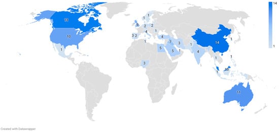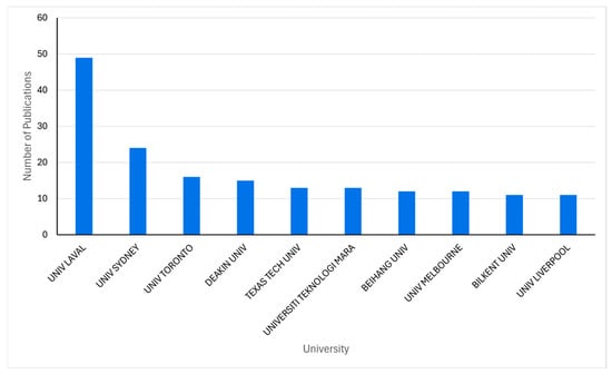 The most productive 10 institutions in biophilic design research demonstrate notable geographical diversity (Figure 6). Université Laval and the University of Toronto from Canada, along with Deakin University, the University of Sydney, and the University of Melbourne from Australia, are among the leading contributors. Universiti Teknologi MARA (Malaysia) and Beihang University (China) are also prominently featured in Asia. In addition, the list includes Texas Tech University from the USA, Bilkent University from Turkey, and the University of Liverpool from the United Kingdom. This range highlights the global engagement and multidisciplinary interest in biophilic design across both Western and non-Western academic institutions.